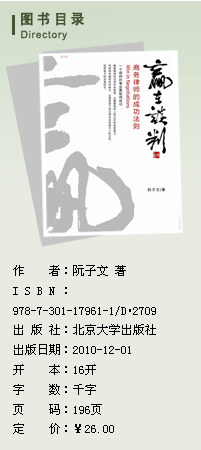 在廣泛搜索的過程中,一個偶然的機會,我邂逅了言辭犀利、文思敏捷的北師大民商法博士研究生,廣西思貝律師事務所的主任律師阮子文,這個男一號才算有主了,呵呵。阮律師告訴我,他平時有做總結、寫東西的習慣,正巧有一些關于談判的文稿,可以發(fā)給我先看看;但看他那么年輕,我還是謹慎地把他的簡介也順便要了來。看完初稿,我覺得眼前一亮,挺不錯的,這正是我想找的稿子。(詳情請參見后文所附圖書信息,自己鑒別,以免有自夸嫌疑,呵)但再看看他的簡介,心里又不免有些打鼓。這家伙有點年輕,呵呵。不過轉而又有一些嫉妒,這家伙就比我大半年,竟然這么有才。于是,便有了作者的“后記”中提到我說的那句話:“不一定都是資深大律師才有資格介紹和推廣自己的執(zhí)業(yè)經(jīng)驗,年輕的新銳律師同樣也可以,因為一位律師的成功和執(zhí)業(yè)年限不是必然成正比的?!焙髞淼暮髞?,便有了《贏在談判》這本新銳律師的新銳之作。