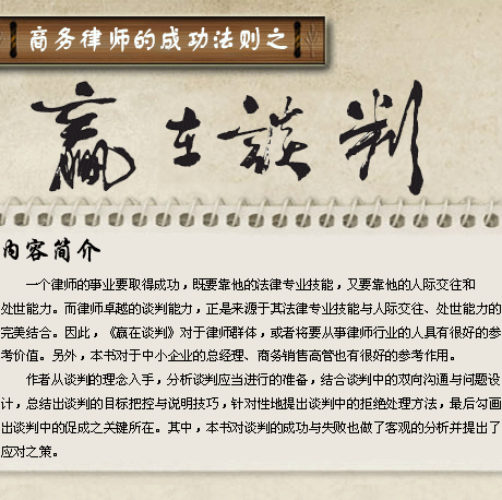 2009年9月的一天,當劉俊海老師再次喊我去聽了一場美國密歇根大學賽戴爾教授關于談判的講座后,雖然我不怎么聽得懂(因為是全英文的),但劉俊海老師的那段評語卻給我留下了深刻的印象:“我以前一直和我的學生說,法學院的畢業(yè)生應當具備三種能力:論文寫作的能力、法律文書寫作的能力和分析案例的能力?,F(xiàn)在,聽了賽戴爾教授的演講,我認為法學院的學生應當具備的能力還得加上一種,那就是談判。”這句話,也就是《贏在談判》封底上那段劉俊海老師“支援”的“法學院的畢業(yè)生不僅應具備論文寫作的能力、法律文書寫作的能力、分析案例的能力,還應當具備良好的談判能力 ”的來源。由此,我想琢磨一下做一本談判類圖書是否會有市場。