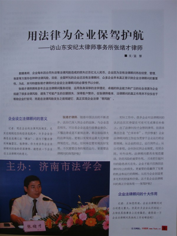 張緒才律師,山東緒才律師事務(wù)所主任、執(zhí)業(yè)律 師,具有嚴(yán)謹(jǐn)?shù)倪壿嬎季S能力和較高的法律職業(yè) 素養(yǎng),辦案實踐經(jīng)驗豐富,注重專業(yè)知識與辦案 技巧相結(jié)合。代理訴訟及仲裁案件數(shù)百件,擔(dān)任 十多家大型企業(yè)和行政事業(yè)單位常年法律顧問, 為當(dāng)事人維權(quán)案值累計過億元。先后多次榮獲“優(yōu) 秀律師”及多家專業(yè)網(wǎng)站“濟南首席律師”榮譽稱 號。執(zhí)業(yè)理念:以專業(yè)和執(zhí)著維護(hù)正義,用愛心 和忠誠贏得感動!聯(lián)系方式:手機 15854131328,:719251212。 |